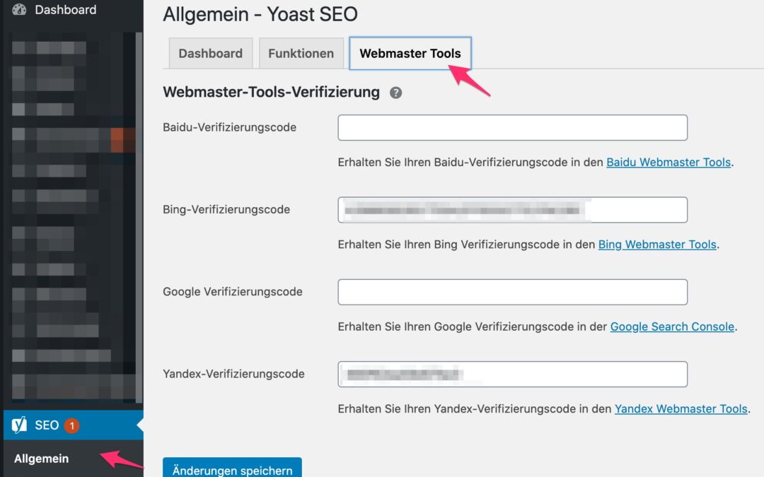 Kopieren Sie den Zahlensalat zwischen den Anführungszeichen hinter content= und fügen Sie ihn unter SEO > Allgemein > Reiter: Webmaster Tools in das für den Google Verifizierungscode vorgesehene Eingabefeld ein und klicken auf Speichern.