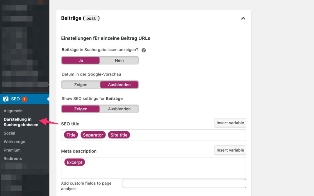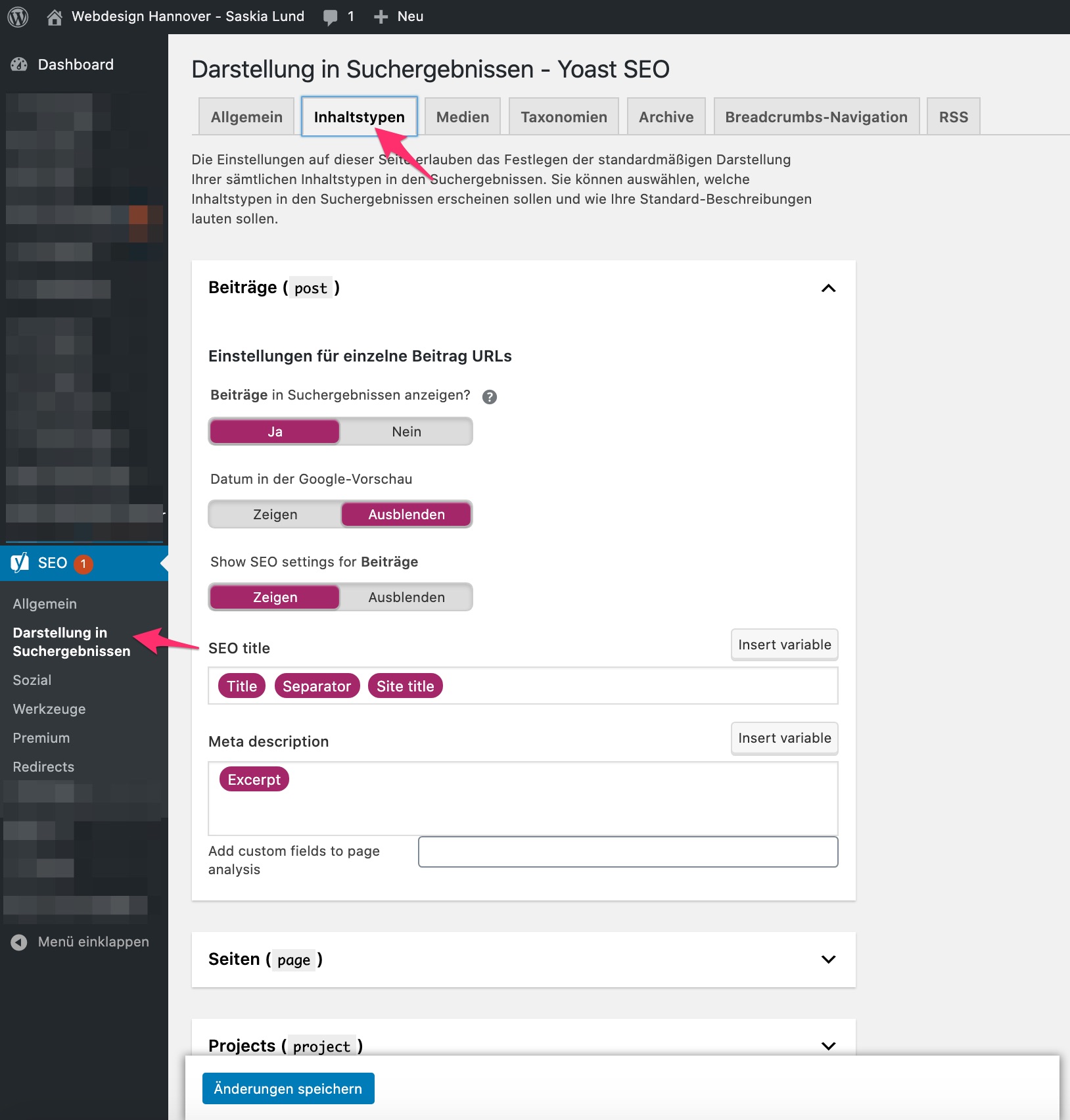Yoast SEO - Darstellung in den Suchergebnissen - Reiter: Inhaltstypen