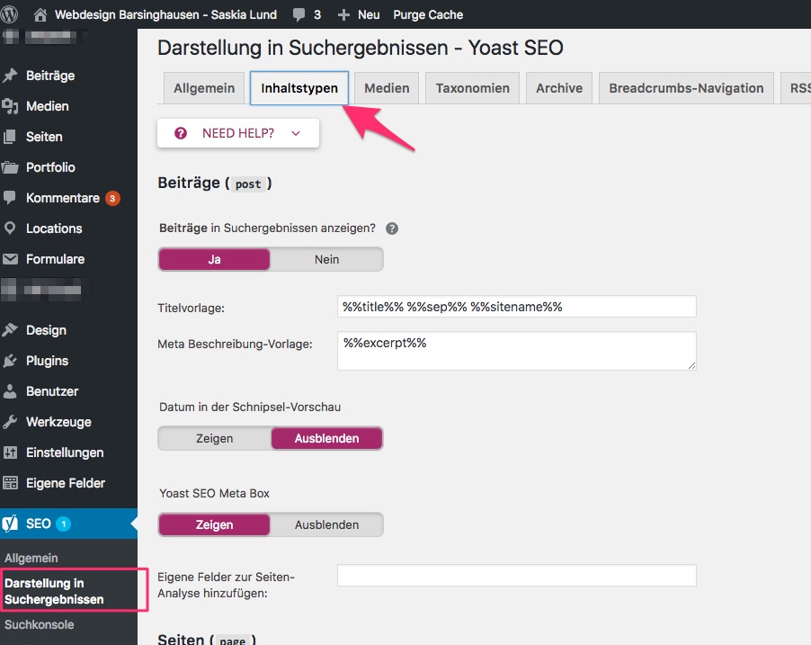 Yoast SEO 7.x - Darstellung in den Suchergebnissen - Reiter: Inhaltstypen